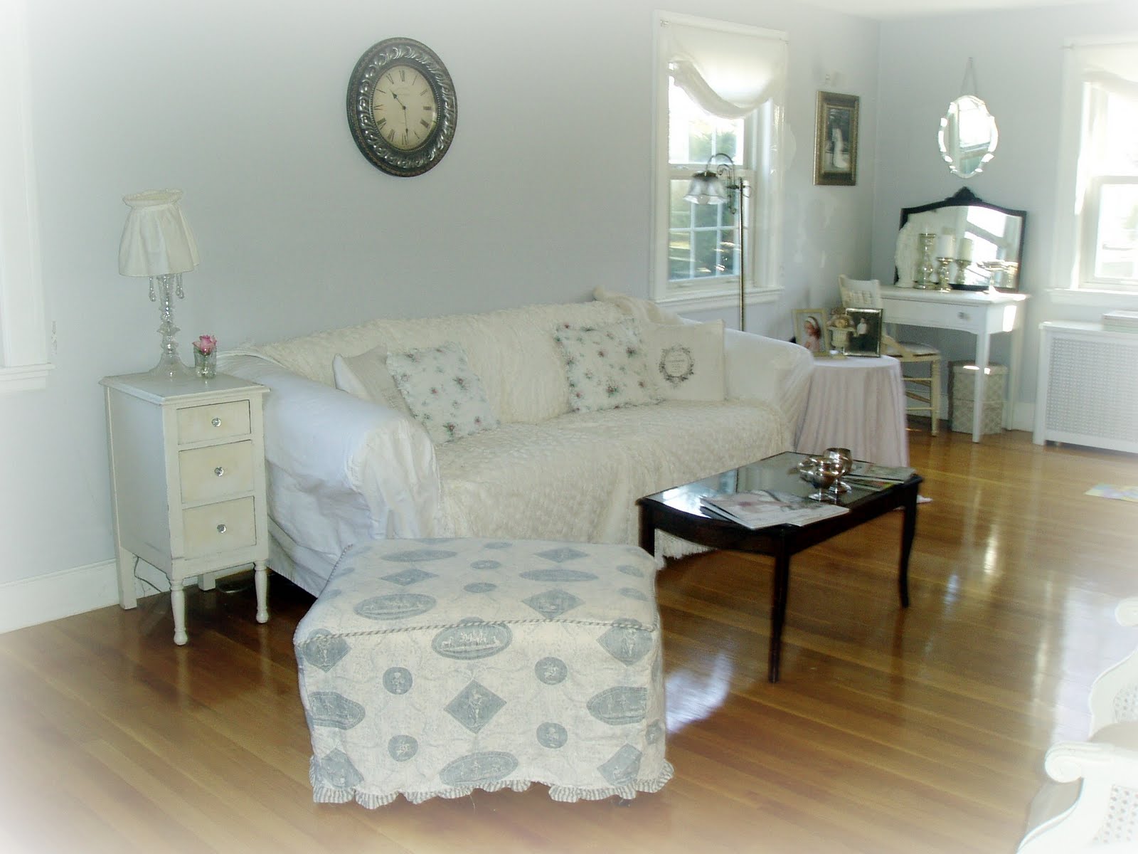 The pleated tablecloth was sewn from cloud blue Shabby Chic fabric I scored on Fabric.com after the unfortunate 'Shabby Chic' liquidation. I'm so happy Ms. Ashwell has since returned renewed with Shabby Chic Couture!